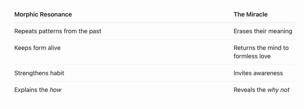 In that sense, morphic resonance explains how pain can linger. But the miracle shows how love can interrupt it.